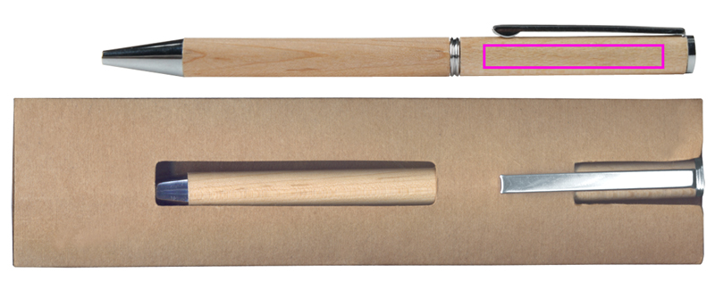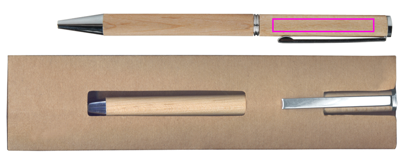 Klassischer Holzkugelschreiber mit blauschreibender Kunststoffmine und Kartonetui. Ihre Werbung gravieren wir unterhalb des Clips.