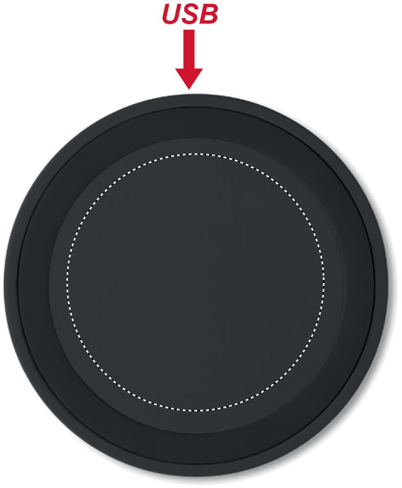 Kleine, runde induktive Ladestation. Beleuchtete Ladeanzeige. Ausgang: DC5V/1A (5W). Kompatibel mit allen QI-fähigen Geräten wie den neuesten Android Smartphones, iPhone® 8, 8S und X und höher.