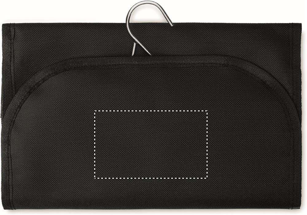 Reisenecessaire aus 600D und 300D Polyester. Mit diversen Netztaschen und zusätzlichem Fach aus PEVA.