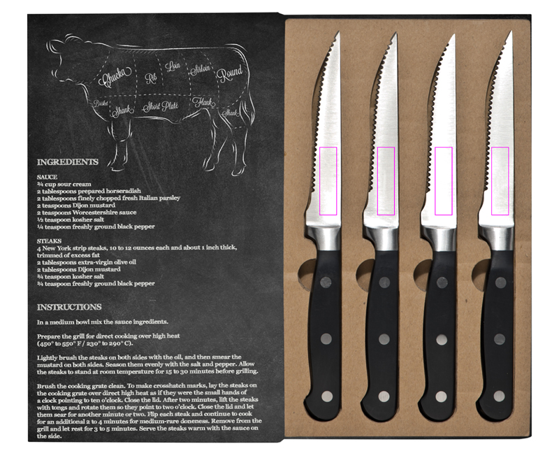 Geschichte vom Fleisch! Für das perfekte Steak braucht man die perfekten Messer, sonst sieht Ihr Steak mehr oder weniger wie Hackfleisch aus. Dieses Steakmesser-Set ist aus rostfreiem Stahl und die Qualität ist einfach großartig. Die Verpackung macht das Set noch besser. Wir drucken Ihr Logo im Tampondruckverfahren auf die Verpackung.
