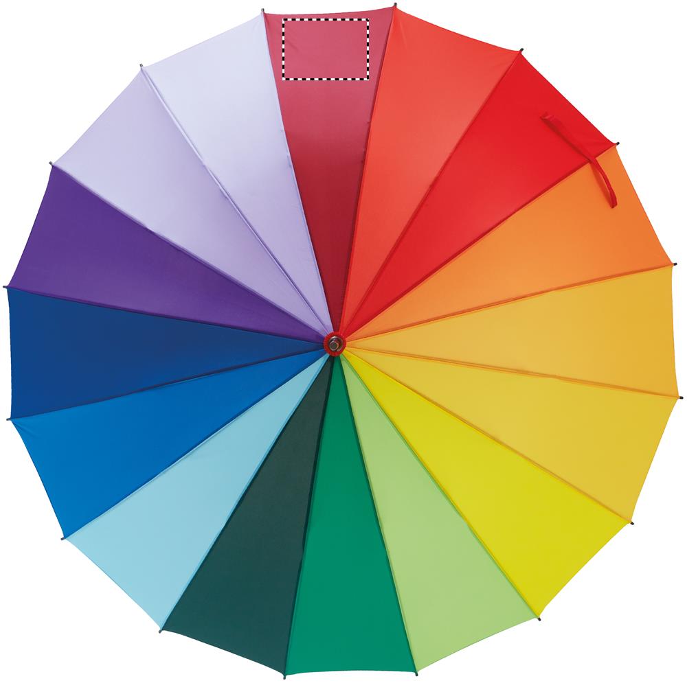 27 inch rainbow auto open umbrella in 190T Pongee with wooden shaft, fibre glass ribs, black plated metal tips and top. 16 panels.