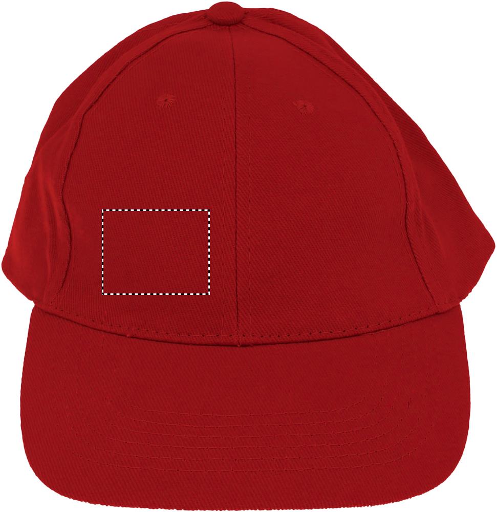6 panel baseball cap in brushed cotton 260 gr/m2  with antique copper finish metal clips on adjustable strap closure. 6 stitched eyelets in matching colour. Size 7 1/4.