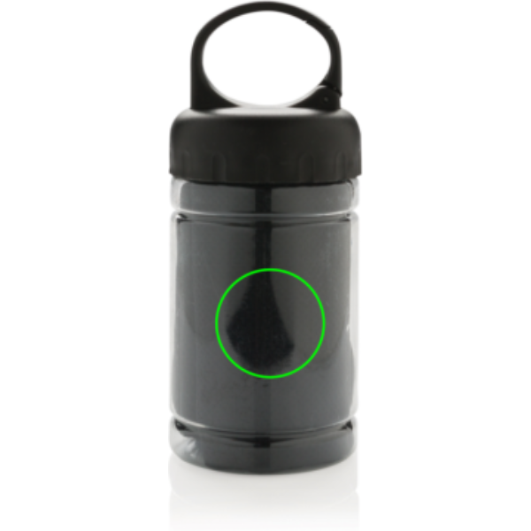 Microfibre cooling towel 100% free of chemicals. 98% sun blocking function up to UV 50+ protection. The towel can be easily used by adding some cold water to the bottle creating a cool towel for fast refreshment. The bottle is made out of PP with ABS top and carabiner to take along on outdoor activities. 77 x 30cm.