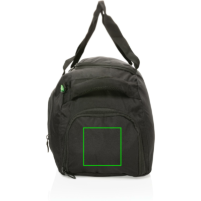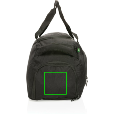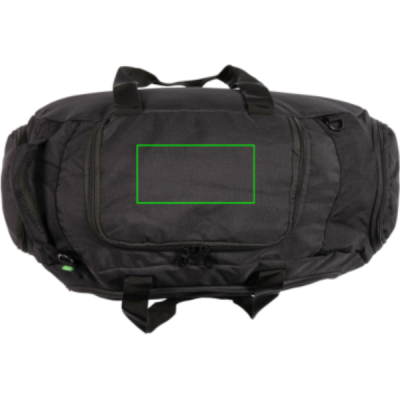 600D ripstop, zippered front pocket with organisers inside, side pocket, shoe pocket, webbing handles and shoulder strap, 4 stand feet on base, PVC free.