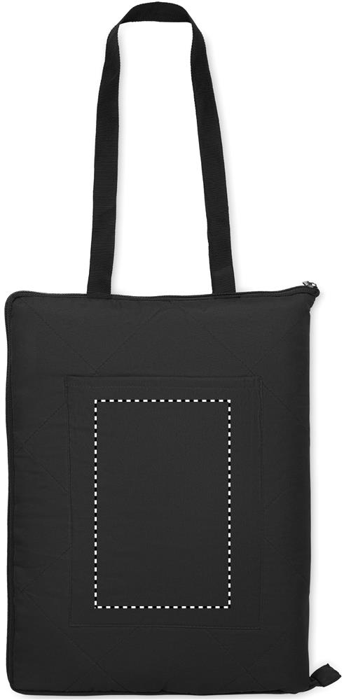Foldable quilted picnic blanket with plastic coated PEVA on the reverse side. Folds into a convenient carry tote bag and has an adjustable shoulder strap. It includes a large front side pocket.