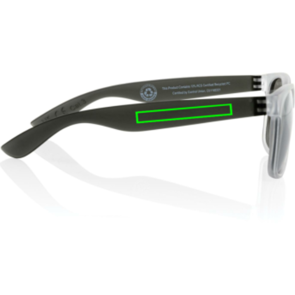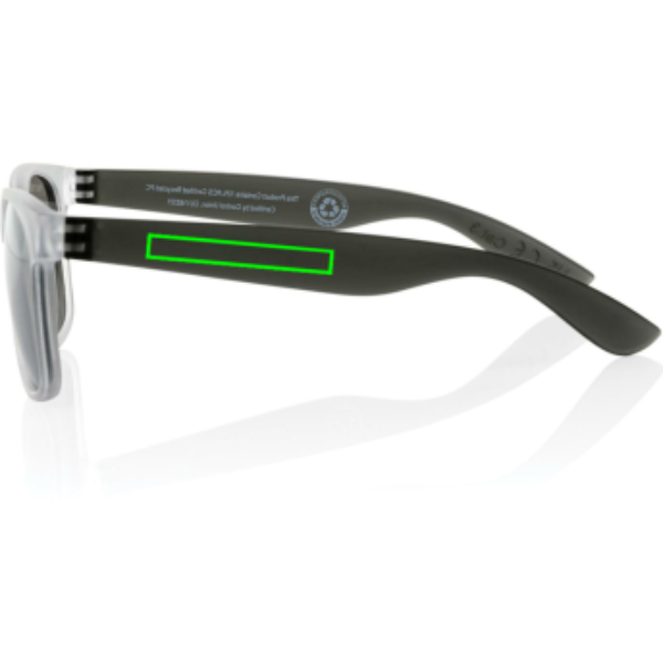 Sunglasses made with RCS certified recycled transparent PC frame. With colored mirrored lenses. Total recycled content: 72% based on total item weight. RCS certification ensures a completely certified supply chain of the recycled materials. The lenses are conform EN ISO 12312-1,UV 400 and CAT 3. Packed in a FSC® kraft box.