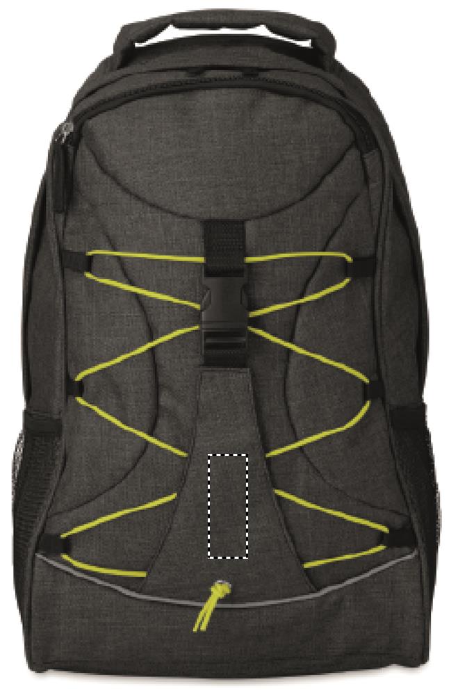 Backpack in 600D 2 tone polyester with colourful contrasting facing and glow in the dark cord on the front panel. Mesh pockets on both sides.