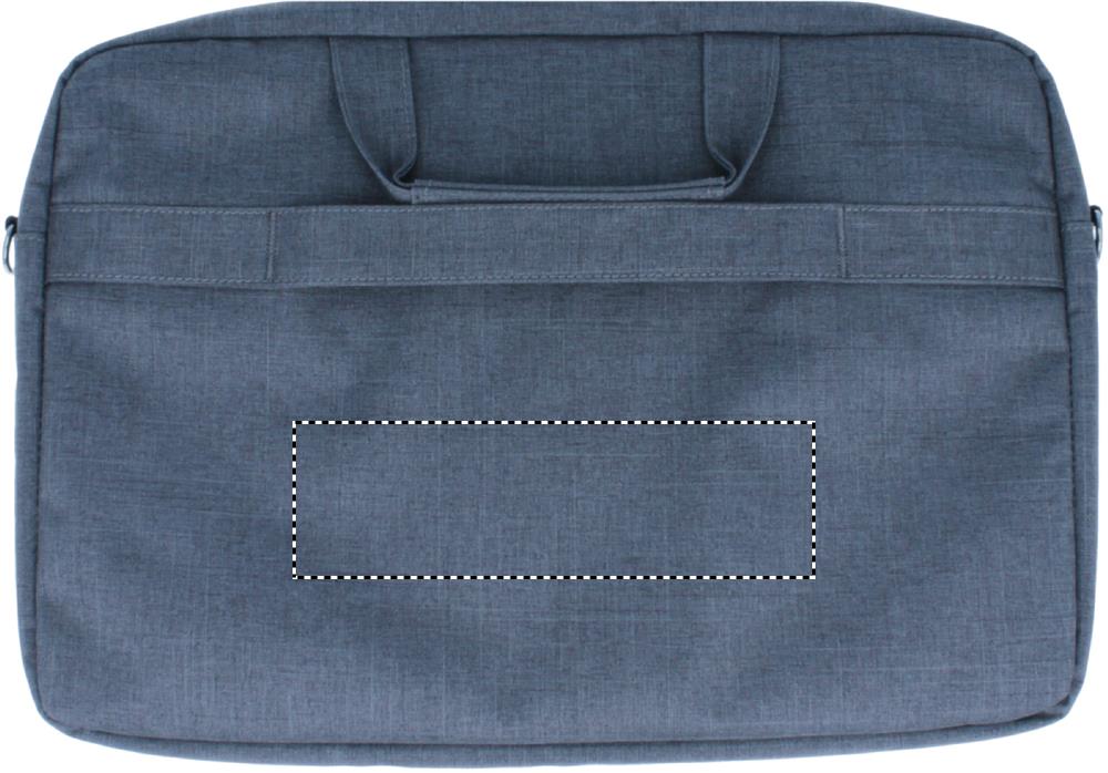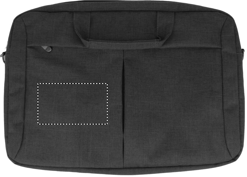 Laptop bag in 360D 2 tone polyester including one main internal compartment for 15 inch laptop and one zippered front pocket. Includes detachable and adjustable shoulder strap. Trolley holder on back side.