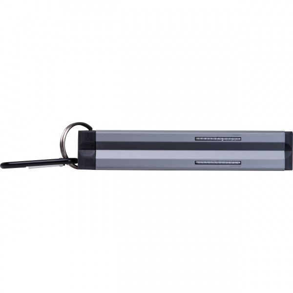 Mini spirit level made of aluminum with ABS plastic applications, two vials, a magnet on the bottom, and a carabiner. Your logo is applied to the spirit level using laser engraving.