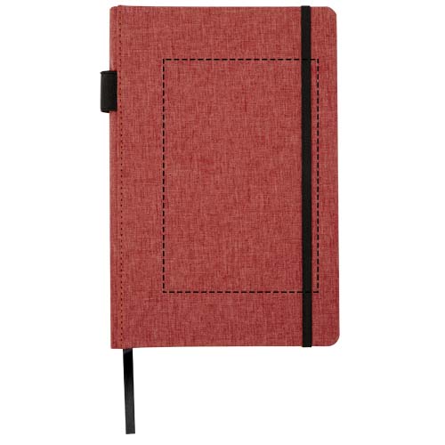 A5 size notebook with cover made of RPET fabric. Features 96 sheets 70 g/m² recycled paper with lined layout, a pen loop and ribbon marker. Packed in a cardboard sleeve.