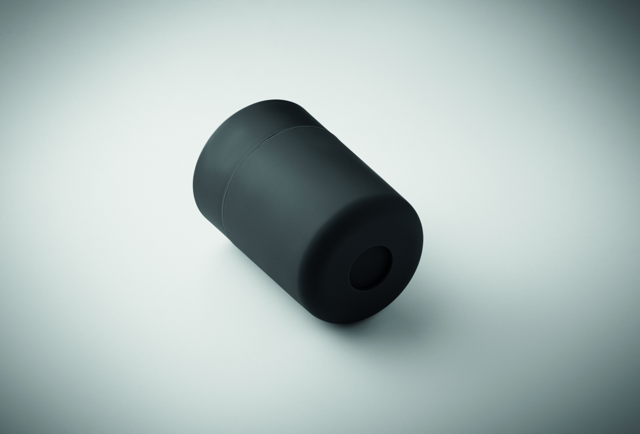 PP tumbler with silicone sleeve and PP sliding lid. Capacity: 330 ml. As this is a single walled mug, heat transfer can still occur.
