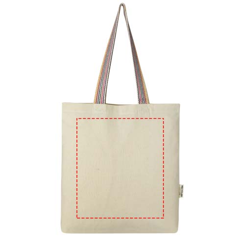 The Rainbow 180 g/m² tote bag is an instant upgrade to the regular cotton tote. Made from pre-consumer recycled cotton, this grocery tote features 25 cm rainbow webbing grab handles, and a 3.5 cm gusset bottom for a bit more storage room. Resistance up to 5 kg weight.