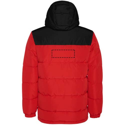 Padded jacket with fixed hood. Front zipper covered with a placket. Chin guard. Two side pockets with zip. Elastic cuffs.