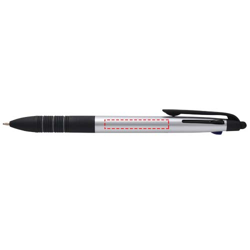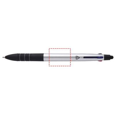 The Trine 3-in-1 ballpoint pen is a versatile writing tool made from RCS certified ABS plastic with a modern metallic finish and an integrated stylus tip for touchscreen use. It features a push-slide mechanism to easily switch between black, blue, and red ink. The ergonomic grip with black anti-slip rubber and grey ring details ensures comfortable handling. Compact, functional, and ideal for branding, the Trine pen is perfect for note-taking, presentations, or digital interactions.