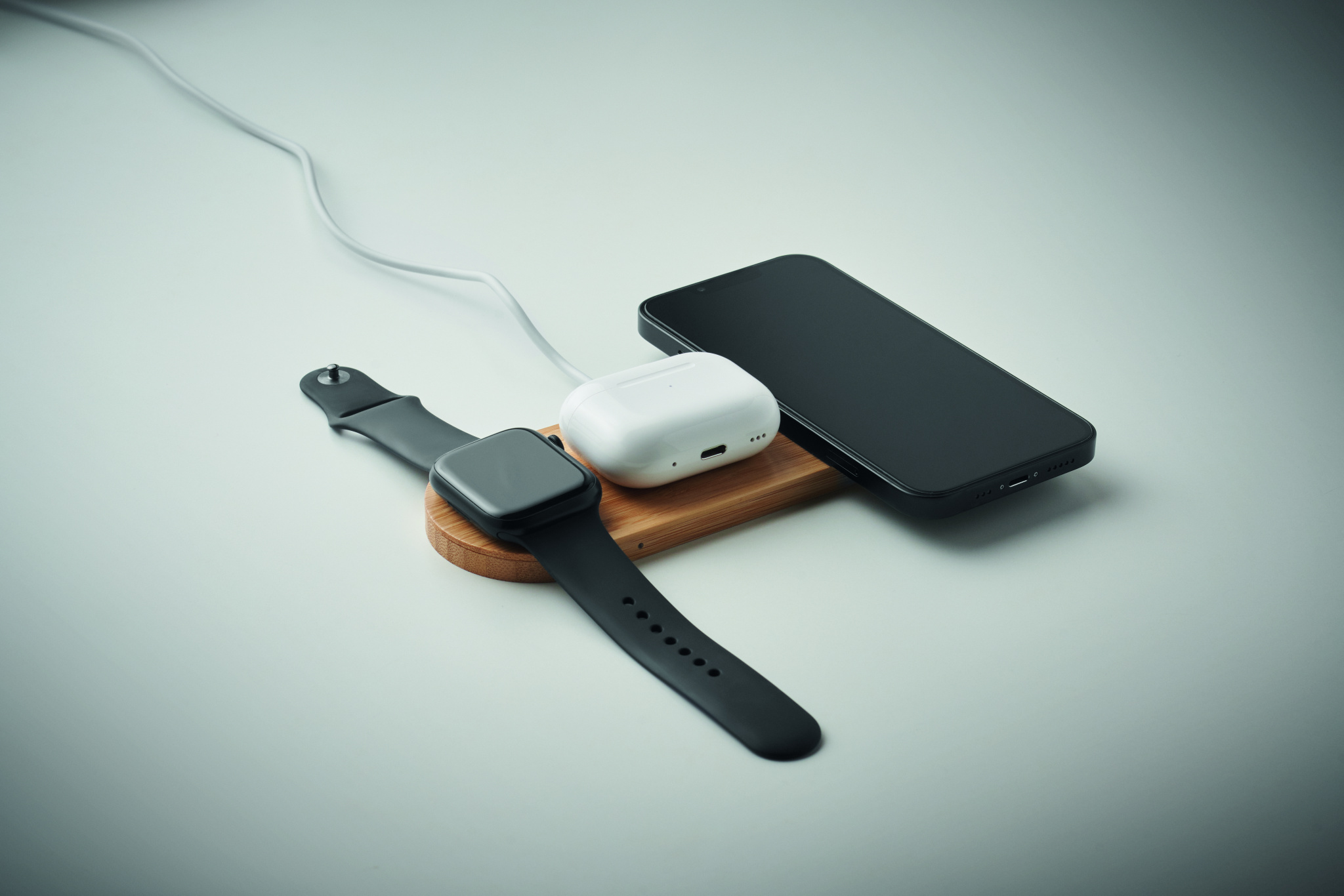 3-ühes laadimisjaam bambusest ümbrises. Komplektis on 15W juhtmevaba laadija, nutikella laadija (ainult Apple®-ile) ja TWS-laadija.