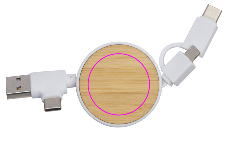 Pikendatav laadimiskaabel plastikust korpuses koos bambusplaadi, USB, 2 C-Type ja iOS-i adapteriga. Teie logo trükitakse bambusest osale.