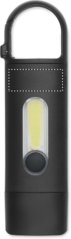 Taskusuurune taaslaetav COB-välklamp ABS-karabiinhaagiga. Hädavalgustus ja 3 valgustusrežiimi. 1 × 3,7 V, 200 mAh taaslaetav liitiumaku (kaasas, ei ole vahetatav).