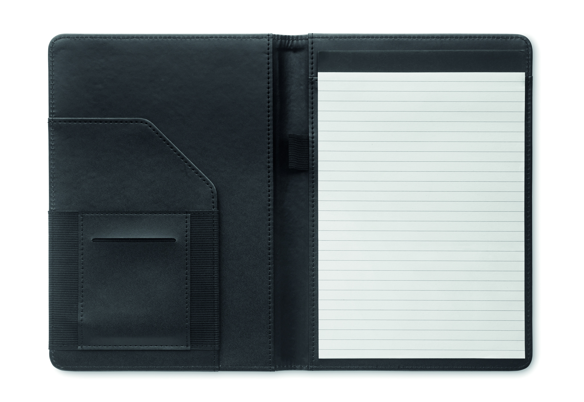 A5 portfoolio 2 tooniga 300D RPET. Vahetatav A5 märkmik. 40 valge joonega bambusest paberilehte (20 lehte). Pliiatsihoidja. Kaardihoidjad siseküljel ja üks suur sahtel.