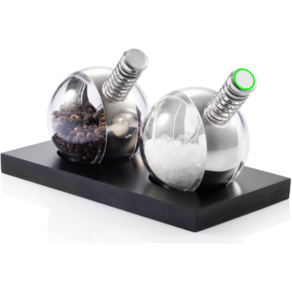 Planet on stiilne pipra- ja soolakomplekt, mille igas jahvatusmasinas on ainulaadne vedrujõuline disain, mis võimaldab mugavat ühe käega kasutamist. Kuna maakerad on läbipaistvad, on meresoola ja pipra taset lihtne näha. Registreeritud disain®