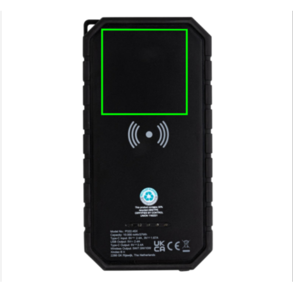 Kiire 10 000 mah 10 W juhtmevaba laadimisega päikesepatarei, mis on valmistatud RCS-i (Recycled Claim Standard) sertifitseeritud ringlussevõetud ABS-i ja TPE-ga. Taaskasutatud kogusisaldus: 30% eseme kogukaalust. RCS-sertifikaat tagab taaskasutatud materjalide täielikult sertifitseeritud tarneahela. Toitepank toetab nii laadimist kaabli (tüüp C ja USB) kui ka 10 W juhtmevaba kiirlaadija kaudu. Juhtmeta laadimine ühildub kõigi QI-toega seadmetega, nagu Android uusim põlvkond, iPhone 8 ja uuemad. Sellel on päikesepaneel koos taskulambi ja karabiiniklambriga, mida saab iga koti külge kinnitada. IPX5 veekindel. Aku järelejäänud indikaatoriga. Kaasa arvatud C-tüüpi laadimiskaabel, mis on valmistatud GRS-sertifikaadiga taaskasutatud TPE-st. Pakitud FSC® mix kraft karpi. USB väljund: 5V/2,4A; Tüüp C Väljund: 5V/2,4A .Kaua ja tarvikud 100% PVC vaba