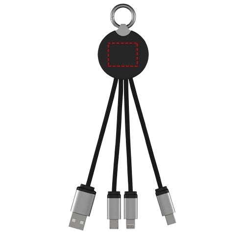 Kummist ja metallist viimistlusega valgustatud logoga laadimiskaabel, millel on kolm pistikut (C-tüüp, Android, iPhone). Üheaegselt saab laadida kuni kolme seadet. Kaablite pikkus (koos pistikutega): 10 cm. Taaskasutatud PET-plastist kaabel ja pakend on valmistatud taaskasutatud paberist ja taaskasutatud plastist.