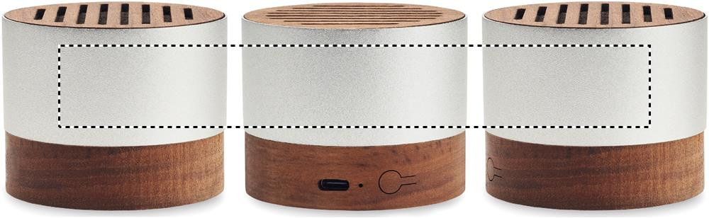 5.3 langaton kaiutin kierrätetyssä alumiinikotelossa pähkinäpohjalla ja yksityiskohdilla. Mukana 1 ladattava Li-ION 300 mAh akku. Lähtötiedot: 3W, 3 Ohm ja 5V. Peliaika n. 3h.