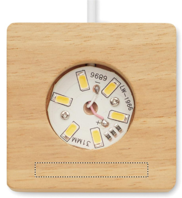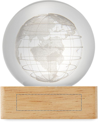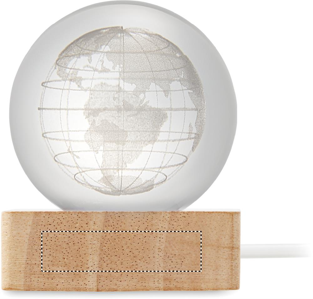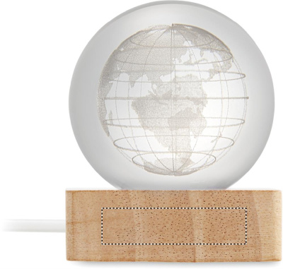 Lasipallo LED-valolla (100 lumenia) kumipuujalustalla. Mukana USB-latauskaapeli (90 cm).