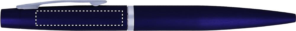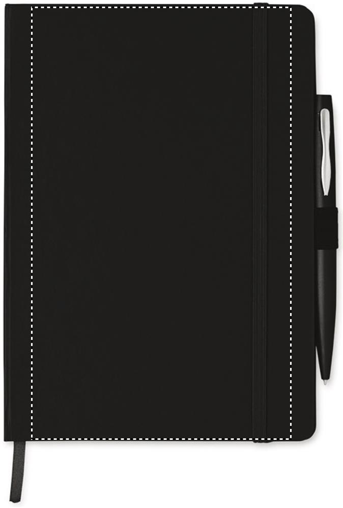A5-muistikirja kartonki kannella, 72 sivua viivattua paperia, kuminauhalla ja kirjanmerkkinauhalla. Sisältää metallisen kuulakärkikynän sinisellä musteella.