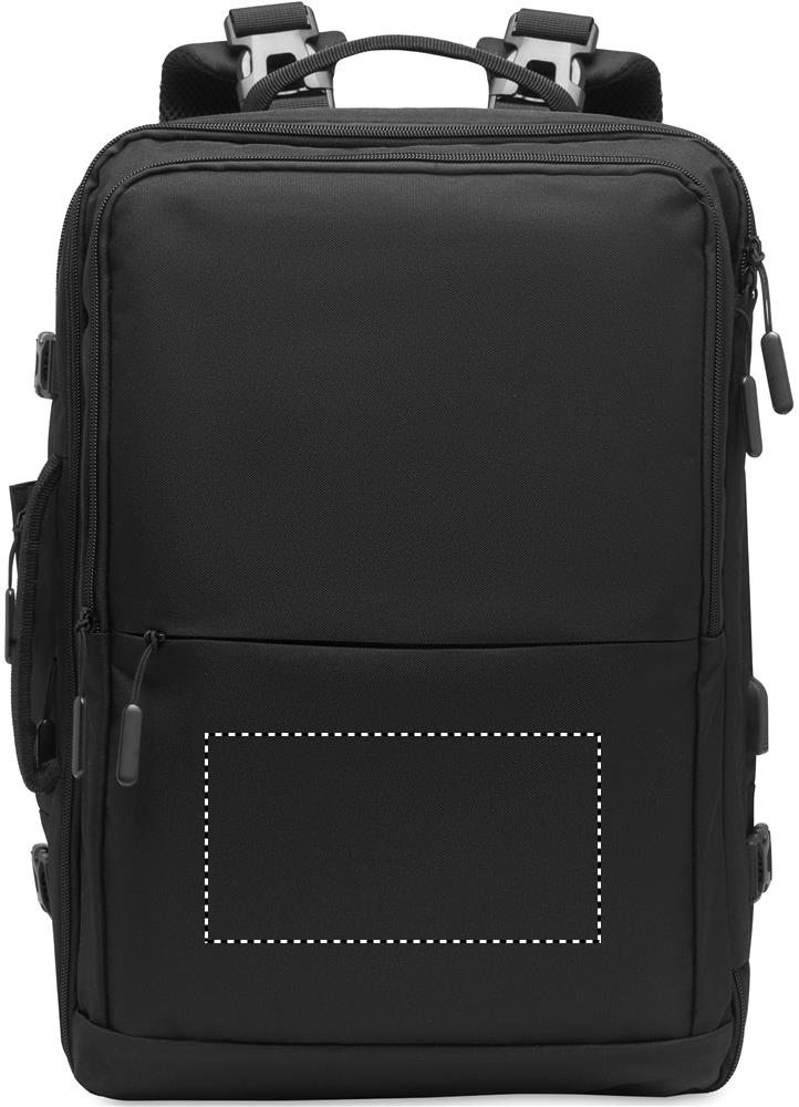 Travel Tech -reppu 600D RPET-polyesteriä. Repussa on useita lokeroita ja taskuja.