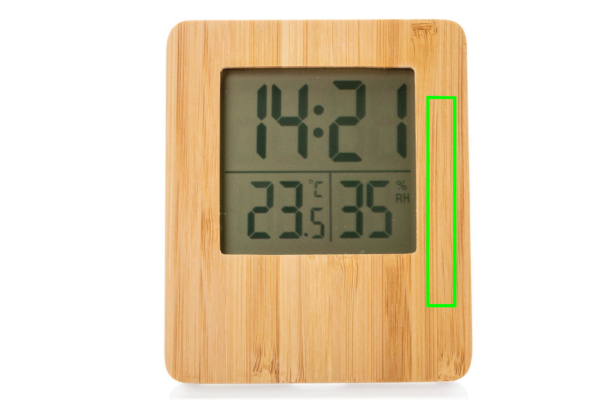 Bambuinen sääasema kolmella toiminnolla: aika/päivä, sisäkosteus ja lämpötila. Sisältää 2 AAA-paristoa. Valmistettu bambusta ja ABS-materiaalista. Kosteudenkesto max. 5%.