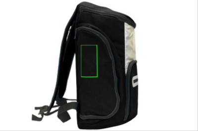 600D kylmälaukku selkäreppuna, metallipinnoite sisäpuolella pitää ruoan ja juomat kylminä. Etupuolella on lisätasku, jossa on painettu värikuvio vetoketjun ympärillä, muiden tavaroiden säilyttämiseen.