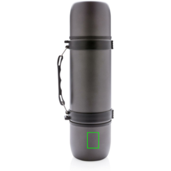 Ruostumattomasta teräksestä valmistettu kaksiseinämäinen termospullo, tyylikäs muotoilu kahvalla ja olkaremmillä. Sisältää kaksi yhteensopivaa kuppia optimaaliseen käyttökokemukseen. Vuototiivis ja vain käsinpesu. Tilavuus 700ml.