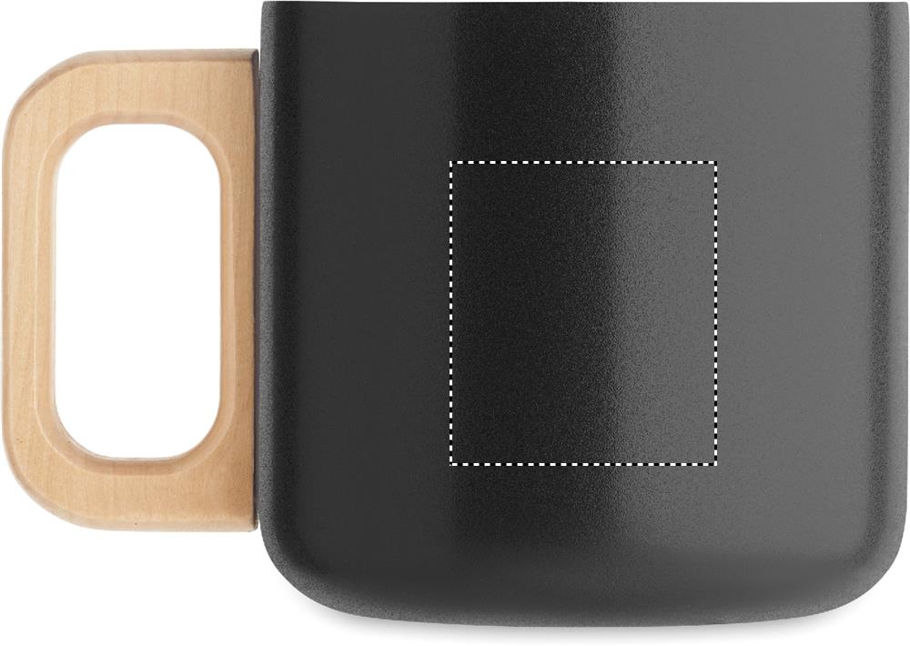 Dvigubos sienelės puodelis iš perdirbto nerūdijančio plieno (90 % perdirbto nerūdijančio plieno ir 10 % nerūdijančio plieno) su medine rankena. Talpa: 350 ml.