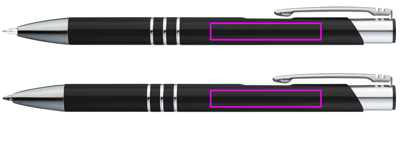 Rašymo rinkinys, pagamintas iš aliuminio, kurį sudaro tušinukas su mėlynu didelės talpos rašikliu ir mechaninis pieštukas, kiekvienas su dekoratyviniais žiedais. Jūsų logotipas bus išgraviruotas klipo dešinėje.
