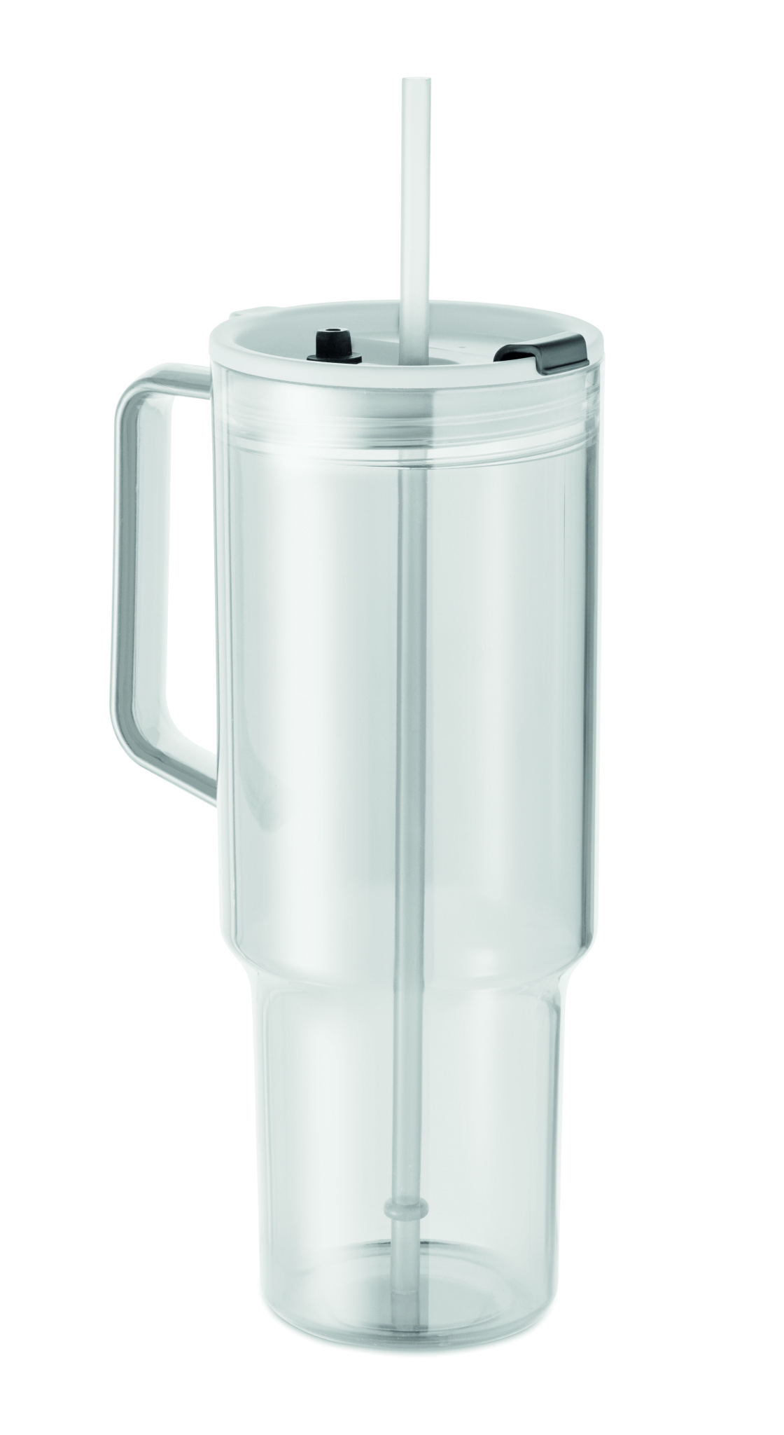RPET puodelis su šiaudelio dangteliu ir PP šiaudeliu. Talpa: 1200 ml.