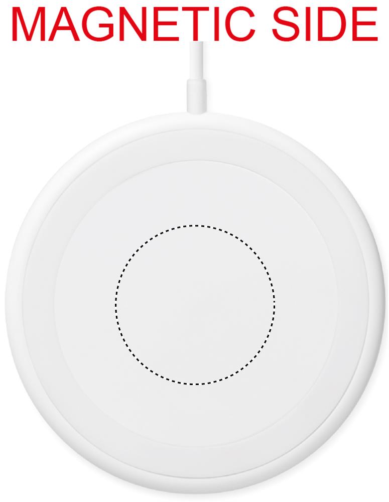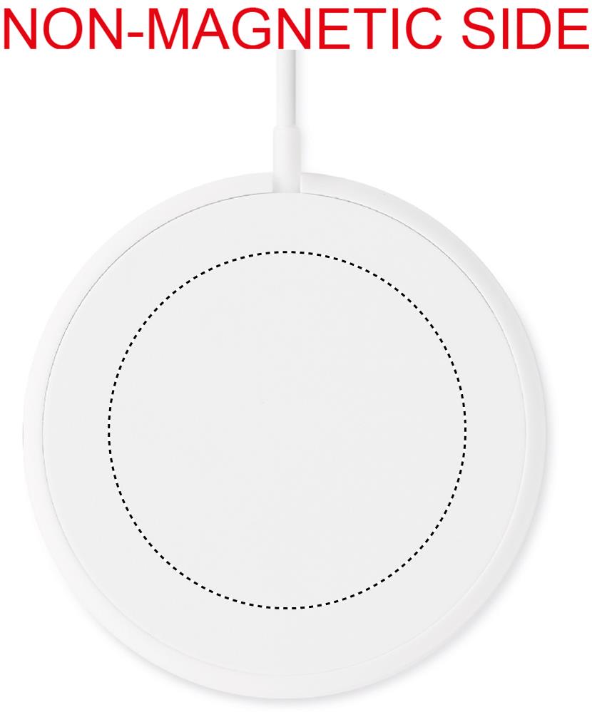 Magnētiskais bezvadu lādētājs no ABS. Izeja: DC 9V/1.1A (10W) ātrai uzlādei. Savietojams ar iPhone® 12 un jaunākiem tālruņiem. Ietver papildu magnētisku metāla gredzenu, lai atbalstītu citu nemagnētisku bezvadu uzlādējamu tālruņu uzlādi.