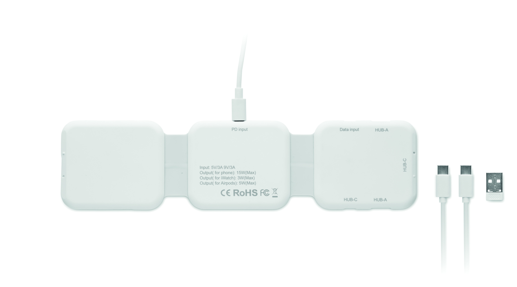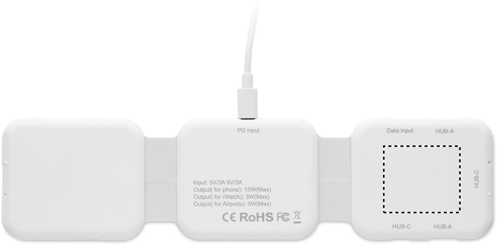 Magnētiskā uzlādes stacija no ABS. 3 bezvadu uzlādes punkti. 1 x 15 W, 1 x 5 W TWS un 1 Apple Watch lādētājs (3 W). 2 C tipa un 2 USB-A centrmezgli. Integrēta kabeļa ieeja: savienotājs no C tipa uz USB-A.