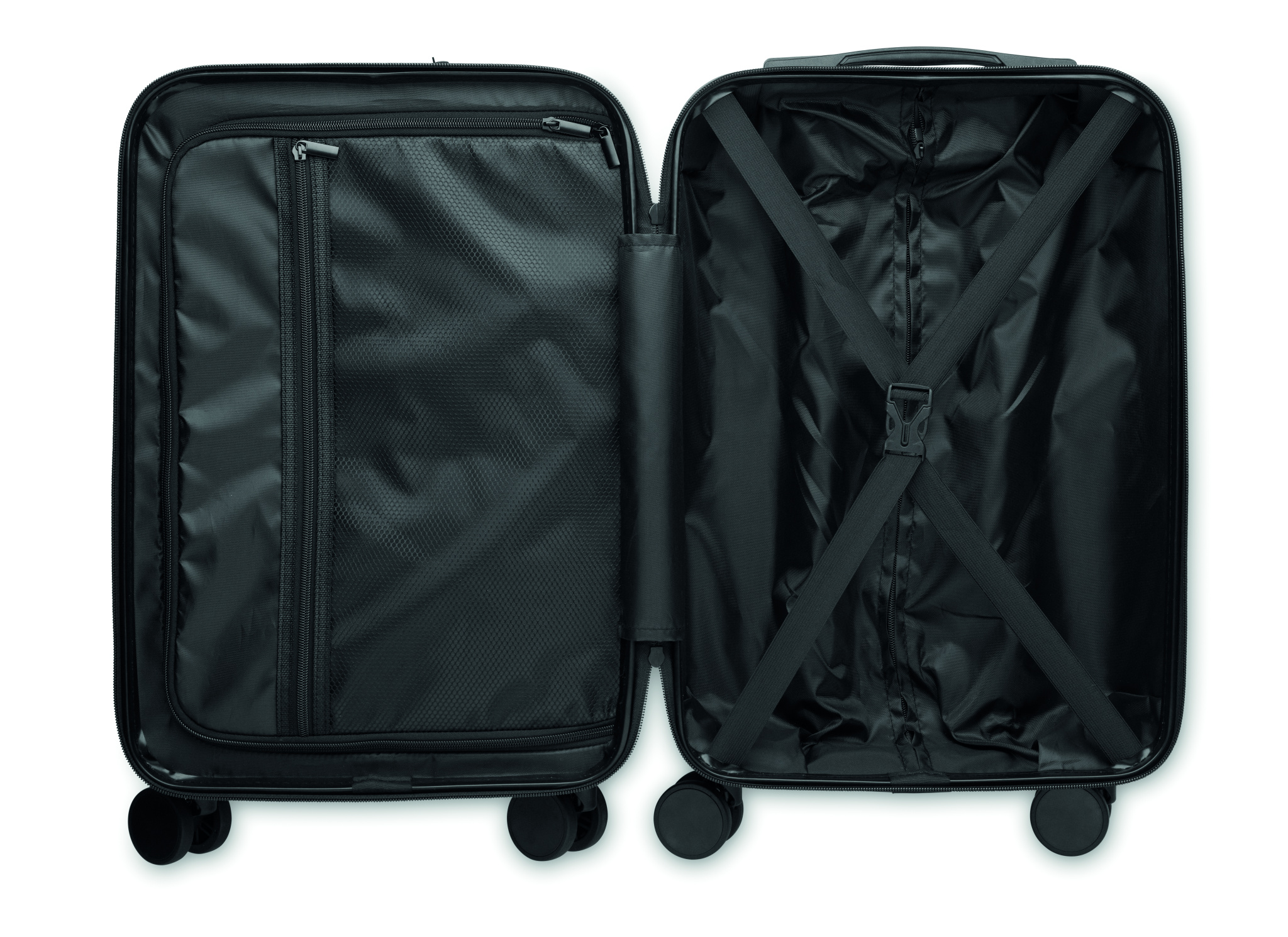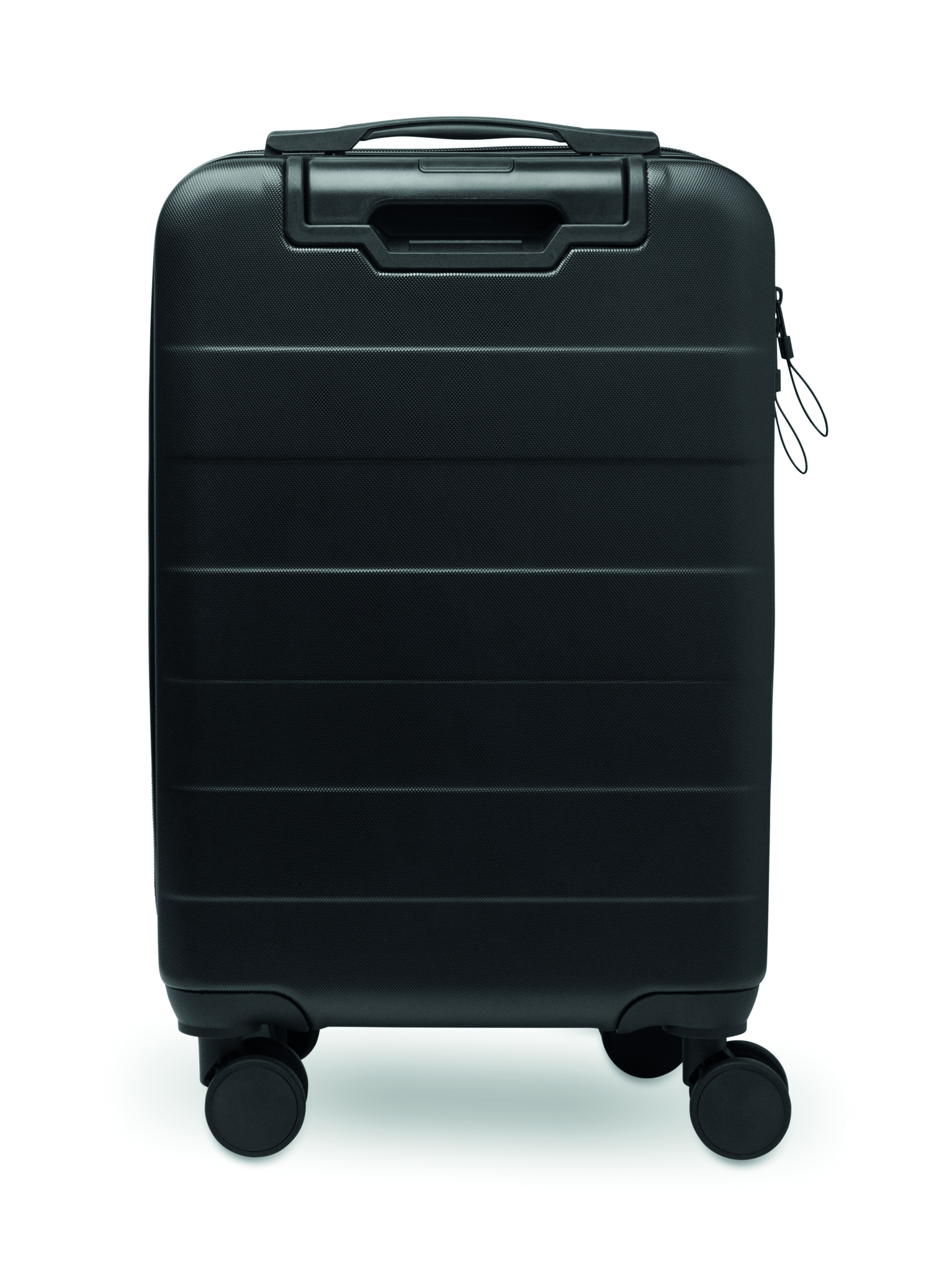 20 inch hard-shell trolley in ABS. 1 main compartment with inner compartment. Additional front zippered compartment for documents and padded 15'' laptop compartment. Includes a security lock (TSA). Rides on 4 wheels.