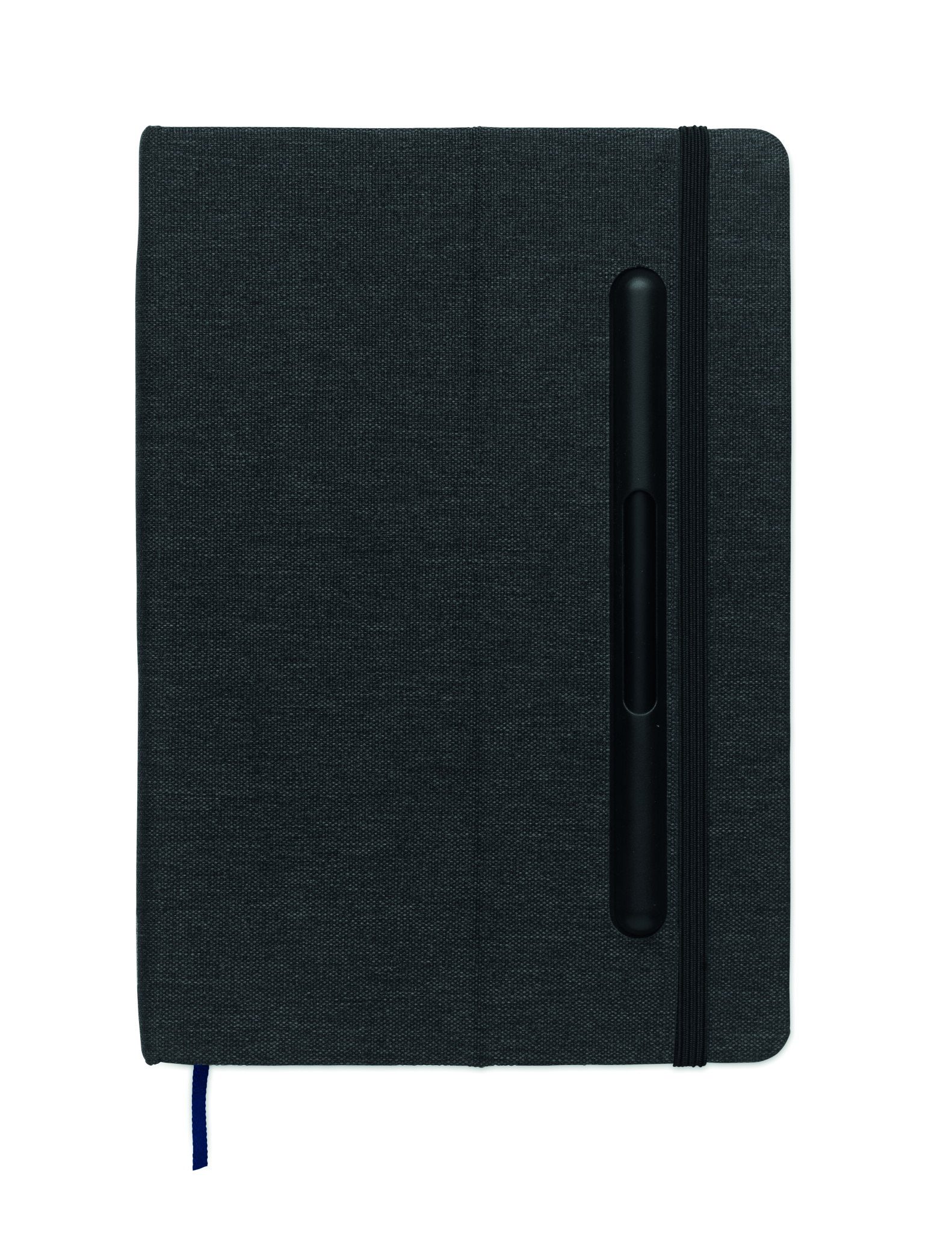 A5 notebook with RPET hard cover with phone holder functionality. Integrated 2-in-1 inkless and regular ballpen in ABS. Casebound. 192 recycled paper lined pages (96 sheets). Matching strap and bookmark.