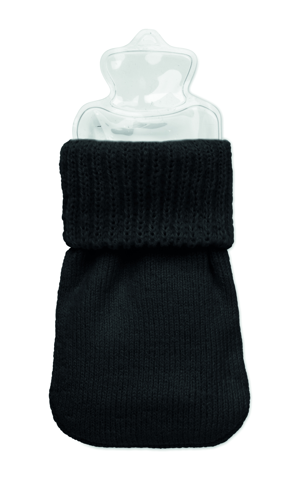 Hand warmer in knitted polyester. Includes instant heat pad in PVC to be activated by pressing the metal plate inside. Reusable by placing pad in hot water.