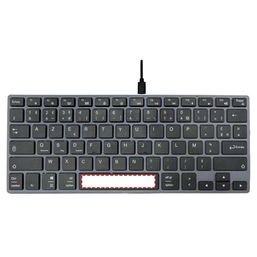 Легкая, но прочная и стильная клавиатура (раскладка AZERTY, 78 клавиш) с алюминиевым корпусом. Клавиатура поддерживает Bluetooth® 4.0 для стабильного соединения и низкого энергопотребления и совместима с ПК/ноутбуком, планшетами, мобильными телефонами, смарт-телевизорами и другими устройствами с функцией Bluetooth®. Радиус действия составляет до 10 метров, также клавиатура имеет встроенную перезаряжаемую батарею емкостью 350 мАч. Поставляется в премиальной коробке из крафт-бумаги с красочной наклейкой.