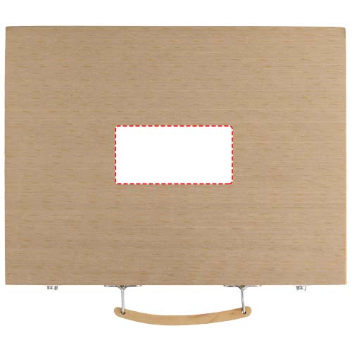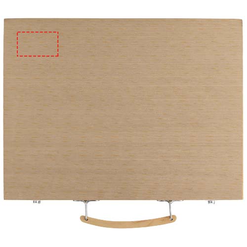 Набор включает 12 акварельных красок, 12 цветных карандашей, 12 цветных ручек, 12 масляных пастелей, 12 фломастеров, 12 мелков, клей, резинку, точилку, карандаш HB и кисточку в деревянной коробке. Нанесение не предлагается на отдельные элементы набора.