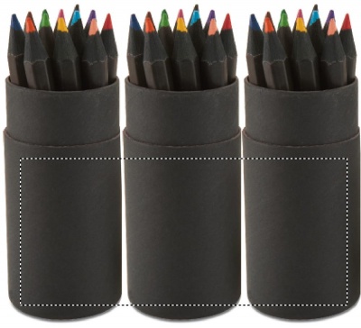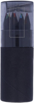 Черный картонный тубус с 12 цветными карандашами и точилкой в крышке тубуса.