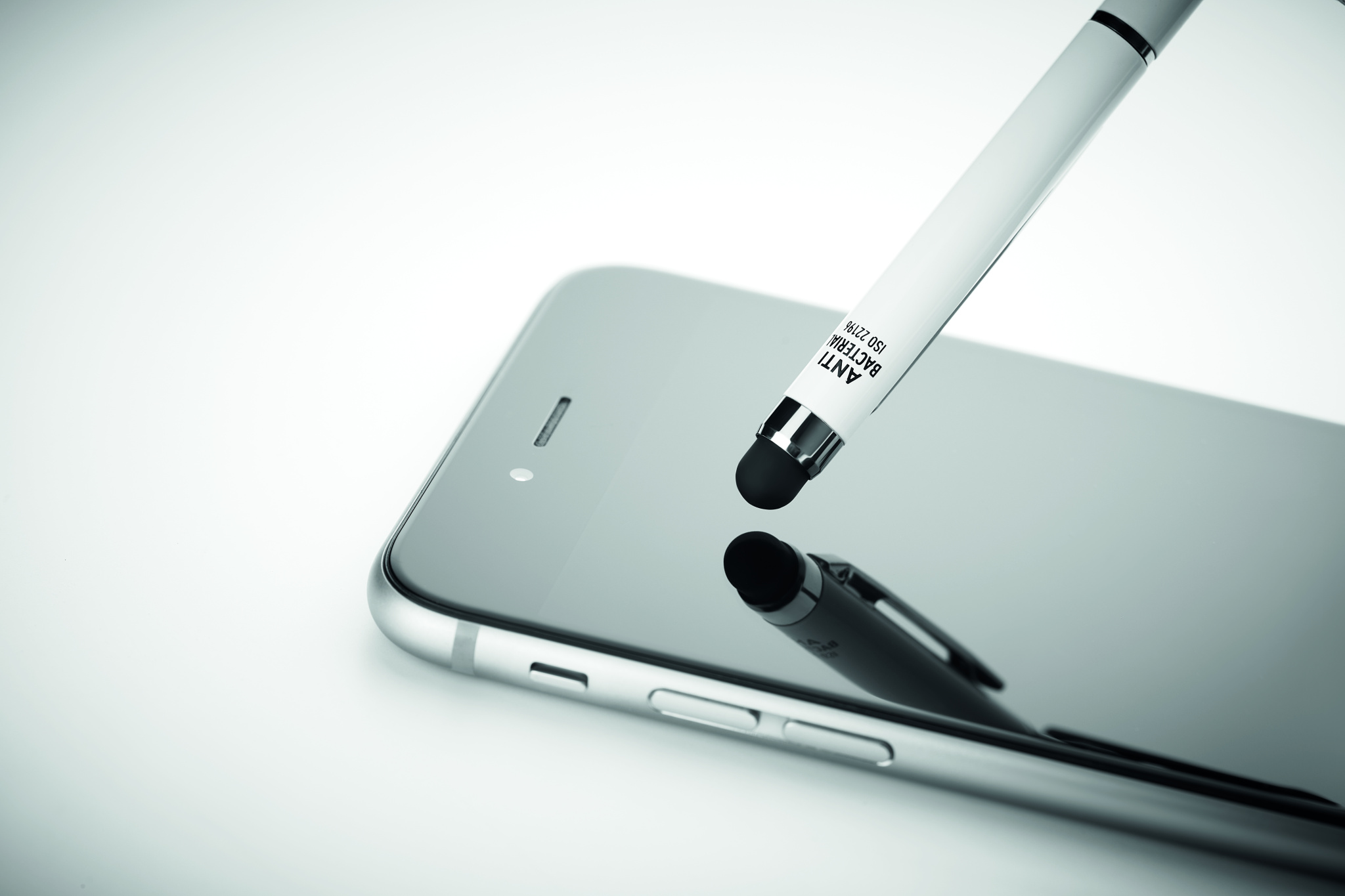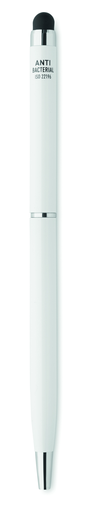 Шариковая ручка-стилус алюминиевая поворотная с антибактериальным корпусом и блестящим хромированным клипом. ISO 22196. Синие чернила.