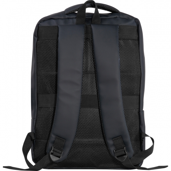 Рюкзак для ноутбука из полиуретана, рассчитан на ноутбуки с диагональю 15–16 дюймов. Он имеет два передних отделения на молнии, большое основное отделение с мягкой подкладкой для ноутбука, несколько внутренних накладных карманов, мягкие плечевые ремни, ручку для переноски и ремень сзади для крепления к чемодану на колесиках. Ваш логотип наносится на переднее отделение.