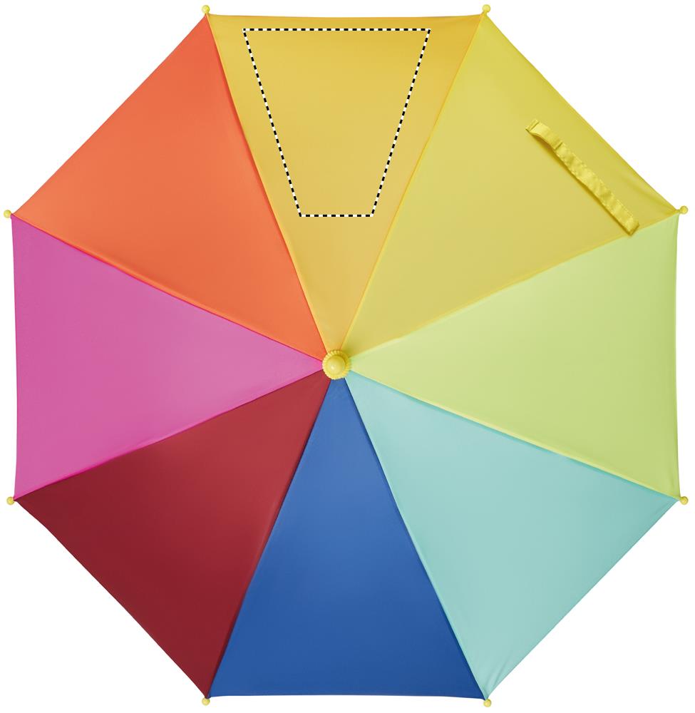 Детский зонт 18 дюймов из эпонжа 190T с радужным рисунком. 8 панелей. Ручное открытие и закрытие. Стекловолоконные стержень и каркас. Пластиковая изогнутая ручка и наконечники.