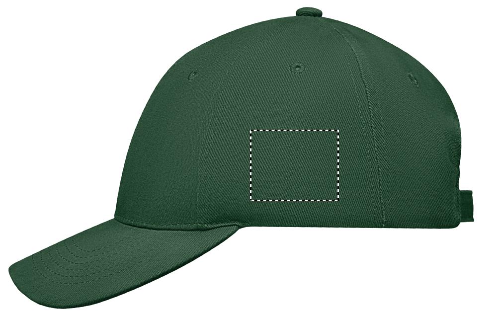 Baseballkeps med 5 paneler i kraftig borstad twill bomull 260 g/m2 med silverstålspänne. 4 broderade öglor i matchande färg. Storlek 7 1/4.