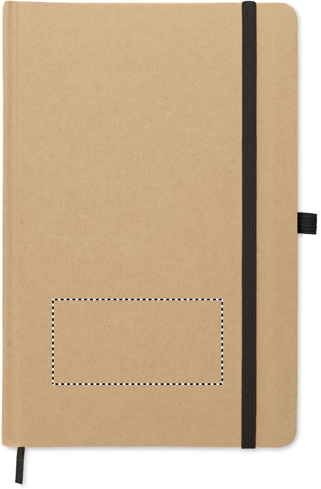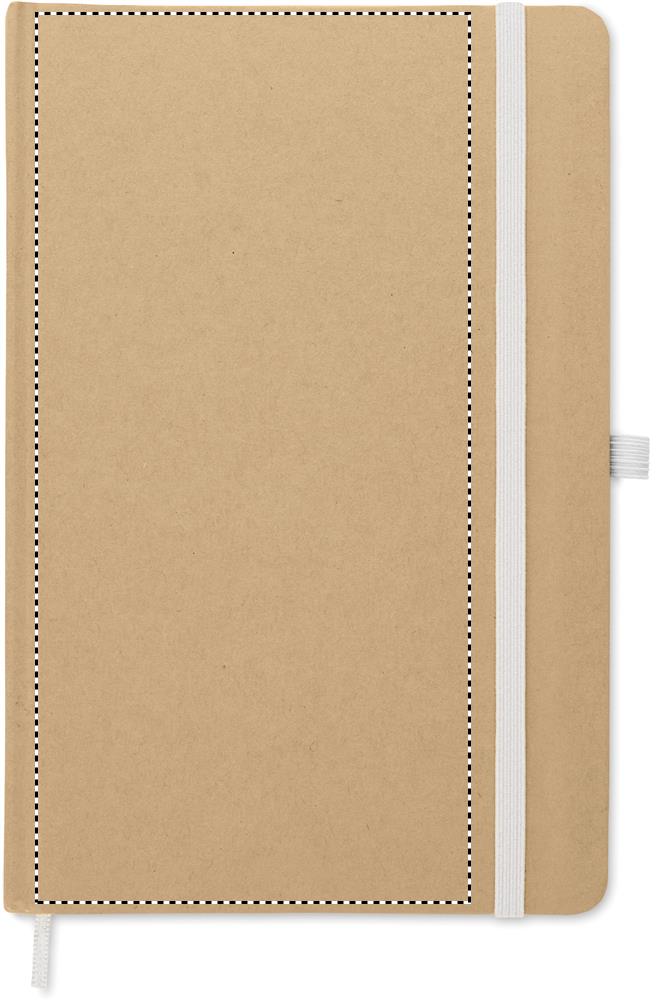 A5 anteckningsbok med omslag av hård återvunnen kartong. Inbunden med 160 linjerade sidor (80 ark återvunnet papper). Elastisk stängsningsband och pennhållare, sidomarkeringsband. Inklusive penna med kropp av återvunnet papper. Blått bläck