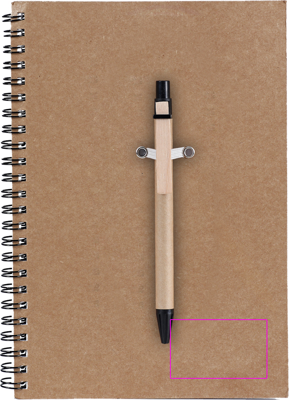 A5 skrivblock av återvunnen kartong och papper med 120 raderade sidor och en kulpenna med blått bläck av återvunnen kartong. Vi trycker din logotyp på omslaget.