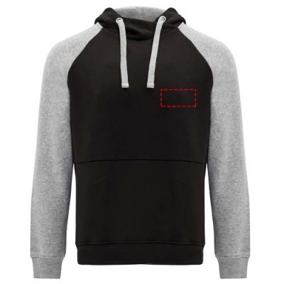 Tvåfärgad unisexhuvtröja. Huva med korsad hals och metallöglor. Kontrasterande innerhuva, dragsko och raglanärmar. Känguruficka. Muddar och fåll i ribbstickad 1 x 1 elastan. Avtagbar etikett.